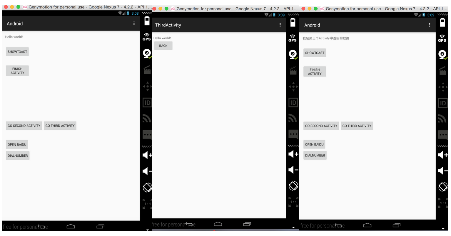 经过上面的步骤,运行效果如下,点击Go Third Activity会跳转到ThirdActivity中,然后从ThirdActivity中点击Back按钮进行返回就会在上一个Activity中的TextView上显示ThirdActivity中返回的值,具体效果如下所示。