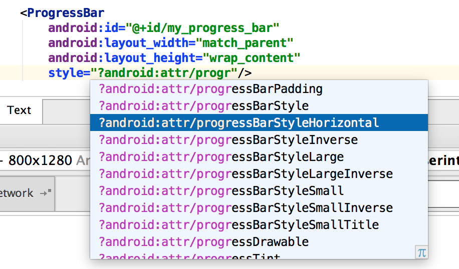<ProgressBar android:id="@+id/my_progress_bar" android:layout_width="match_parent" android:layout_height="wrap_content" style="?android:attr/progressBarStyleHorizontal" android:max=""/>