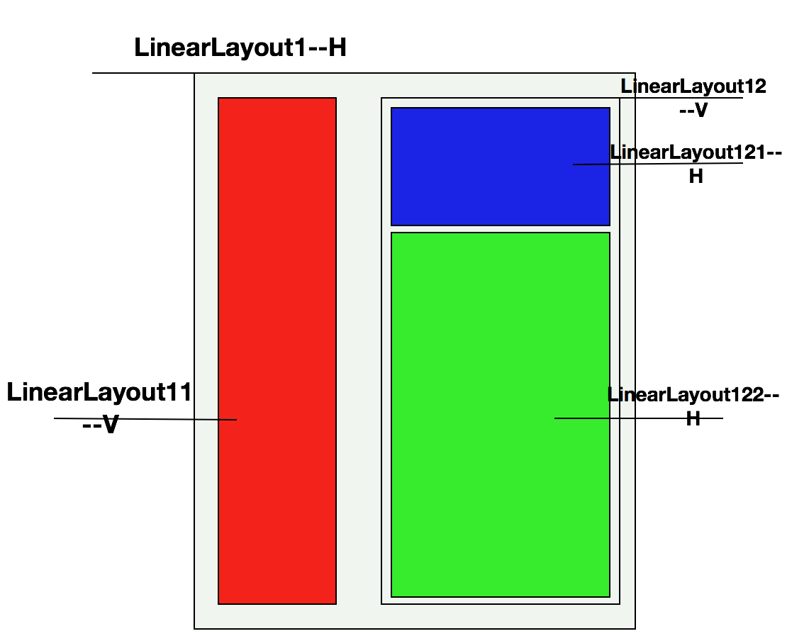 (2) 首先我们先分析布局方式,把每个块进行拆分,分析,然后通过LinearLayout进行组合在一块即可。我们对上述布局方式进行拆分,并且对使用的LinearLayout进行命名,并且指定子视图的布局方式(V-垂直,H-水平),具体的请看下图。最下方我们使用了一个水平布局的LinearLayout1, 在LinearLayout01上又有两个高度等于父视图高度的LinearLayout11和LinearLayout12,两者子控件的布局方式都设置为垂直排列。在LinearLayout12中又有两个子线性布局LinearLayout121和LinearLayout122, 这两个子布局沿垂直方向排列于父布局之上,并且宽度与父布局相等。
