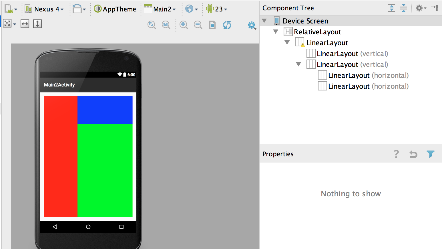 <RelativeLayout xmlns:android="http://schemas.android.com/apk/res/android" xmlns:tools="http://schemas.android.com/tools" android:layout_width="match_parent" android:layout_height="match_parent" android:paddingLeft="@dimen/activity_horizontal_margin" android:paddingRight="@dimen/activity_horizontal_margin" android:paddingTop="@dimen/activity_vertical_margin" android:paddingBottom="@dimen/activity_vertical_margin" tools:context="com.example.lizelu.userinterfacedemo.MainActivity"> <LinearLayout android:layout_width="match_parent" android:layout_height="match_parent"> <!--垂直线性布局方式--> <LinearLayout android:layout_width="pt" android:layout_height="match_parent" android:background="#ff" android:orientation="vertical"> </LinearLayout> <LinearLayout android:layout_width="match_parent" android:layout_height="match_parent" android:orientation="vertical"> <LinearLayout android:layout_width="match_parent" android:layout_height="pt" android:background="#ff" android:orientation="horizontal"> </LinearLayout> <LinearLayout android:layout_width="match_parent" android:layout_height="match_parent" android:background="#ff" android:orientation="horizontal"> </LinearLayout> </LinearLayout> </LinearLayout> </RelativeLayout>