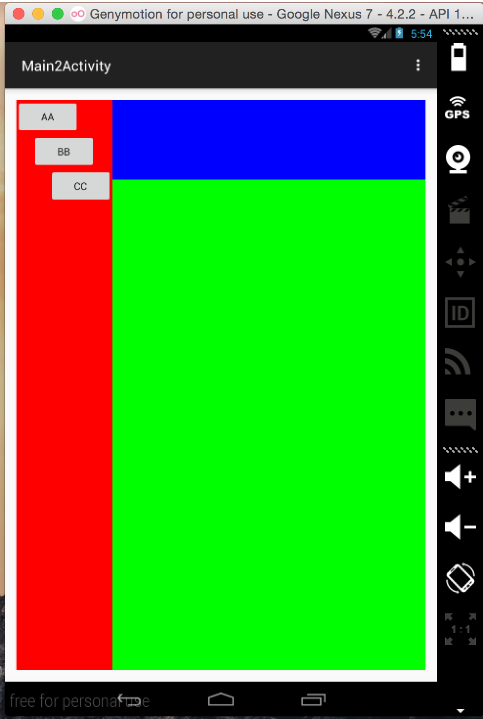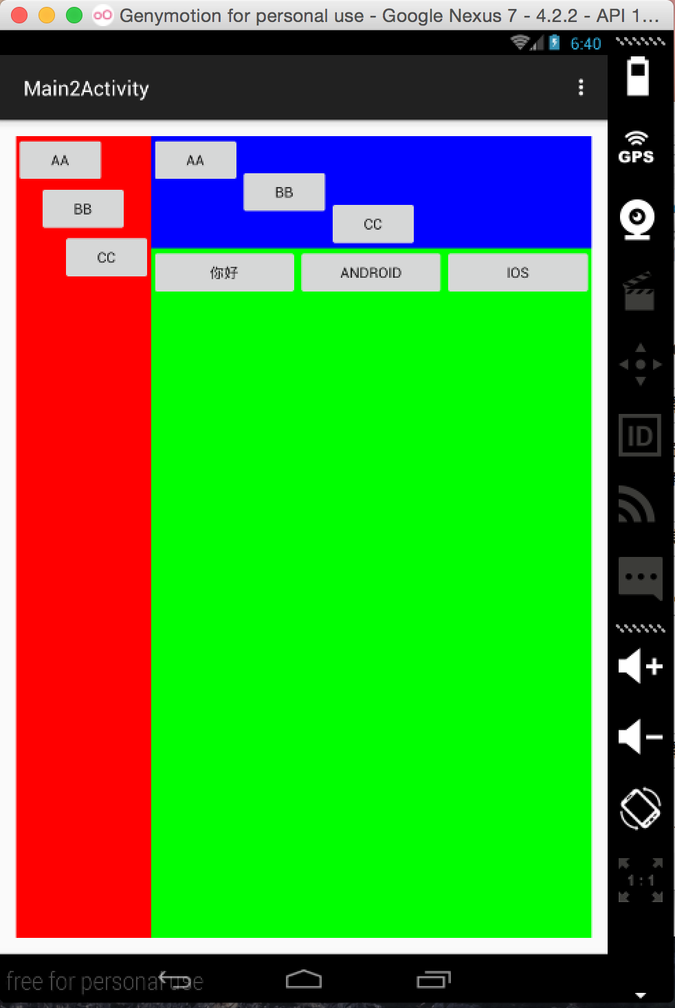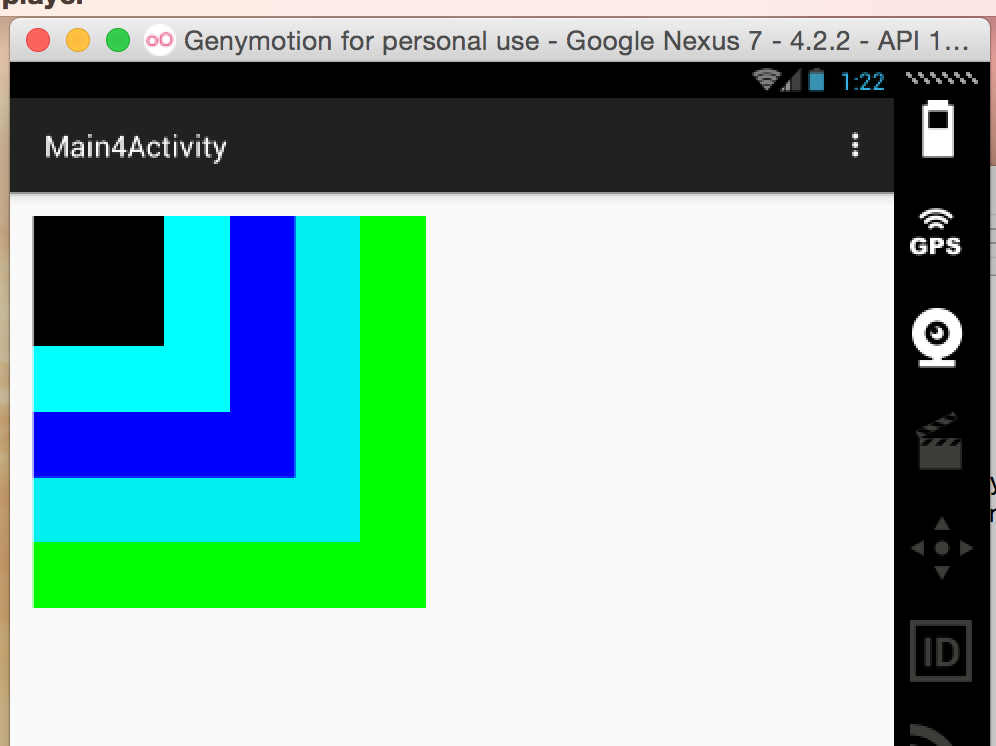 下面是使用FrameLayout做的一个效果,可以看出每块区域中除了大小颜色不一样外,他们的坐标点都是左上角的位置。这也是FrameLayout的特点,下面是运行效果截图: