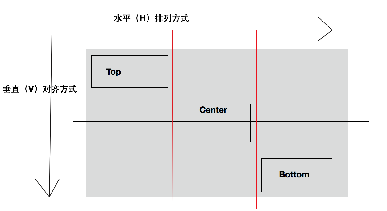 (5) 水平布局控件的对齐方式(Top, Center, Bottom)。如果控件是以水平的方式进行排列的,那么我们就可以对其指定垂直方向的对齐方式,即Top, Center和Bottom。也是通过android:layout_gravity属性来指定的。为了说明一下原理呢,我还是想用一张图来表达一下: