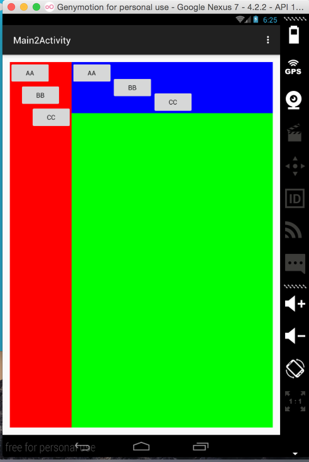 <Button android:layout_width="wrap_content" android:layout_height="wrap_content" android:layout_gravity="top" android:text="aa"/> <Button android:layout_width="wrap_content" android:layout_height="wrap_content" android:text="bb" android:layout_gravity="center" /> <Button android:layout_width="wrap_content" android:layout_height="wrap_content" android:layout_gravity="bottom" android:text="cc"/>