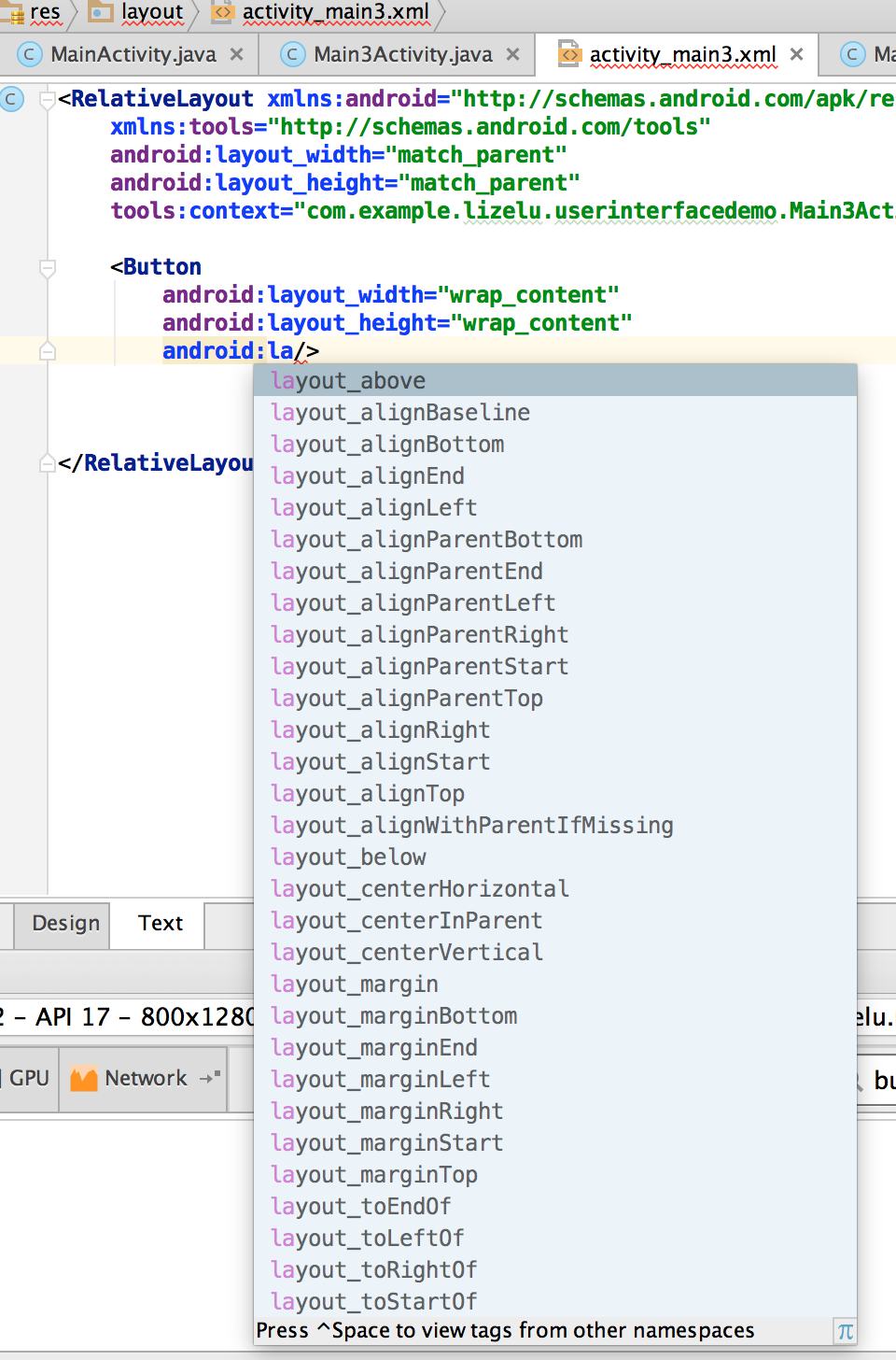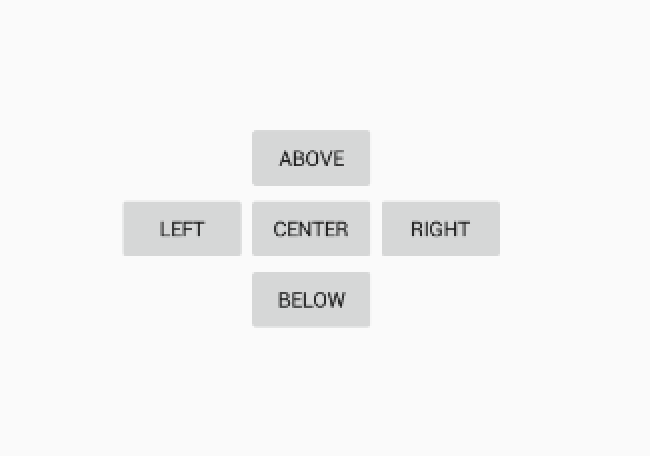 <RelativeLayout xmlns:android="http://schemas.android.com/apk/res/android" xmlns:tools="http://schemas.android.com/tools" android:layout_width="match_parent" android:layout_height="match_parent" tools:context="com.example.lizelu.userinterfacedemo.MainActivity"> <Button android:id="@+id/button_center" android:layout_width="wrap_content" android:layout_height="wrap_content" android:layout_centerInParent="true" android:text="center"/> <Button android:id="@+id/button_above" android:layout_width="wrap_content" android:layout_height="wrap_content" android:layout_above="@+id/button_center" android:layout_centerInParent="true" android:text="above"/> <Button android:id="@+id/button_below" android:layout_width="wrap_content" android:layout_height="wrap_content" android:layout_below="@+id/button_center" android:layout_centerInParent="true" android:text="below"/> <Button android:id="@+id/button_left" android:layout_width="wrap_content" android:layout_height="wrap_content" android:layout_toLeftOf="@+id/button_center" android:layout_centerVertical="true" android:text="left"/> <Button android:id="@+id/button_right" android:layout_width="wrap_content" android:layout_height="wrap_content" android:layout_toRightOf="@+id/button_center" android:layout_centerVertical="true" android:text="right"/> </RelativeLayout>