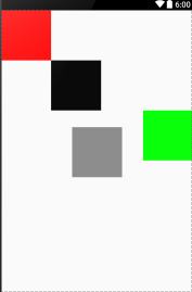 先分析代码,可以看到每一个View都被设置了一个id值,分别为red,black,green,gray和orange。然后通过代码,可以看出black位于red的右边和下面,green位于black的下面并且右对齐其父元素(即RelativeLayout),gray居中对齐父元素(即RelativeLayout), orange位于green的右边同时位于gray的下面,运行结果如图所示: