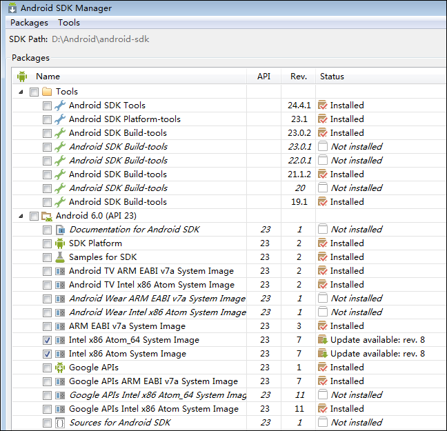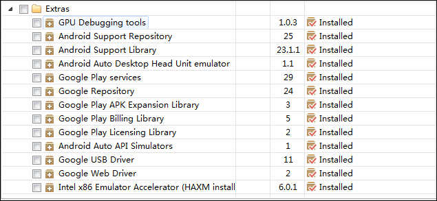 下面是通过SDK Manager下载并自动安装对应的安装包后,应该看到的界面截图(没有截图的都是“未安装”):
