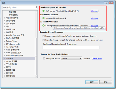运行VS2015,【工具】-->【选项】-->【Xamarin】,指定下面的配置: