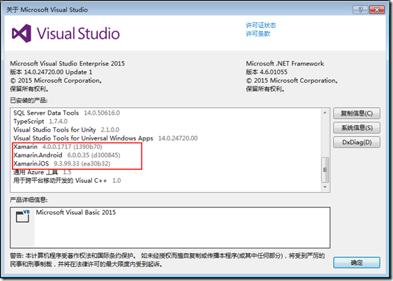 (1)观察VS2015下安装的Xamarin版本