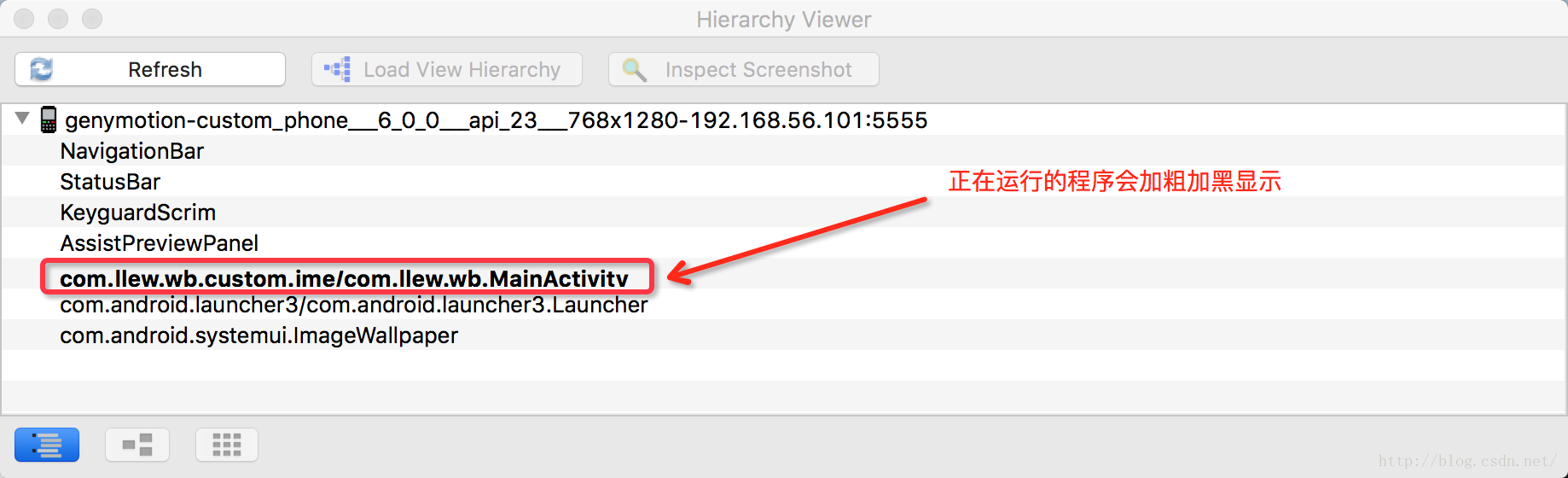 hierarchyviewer打开之后,该工具会列出当前手机可以进行视图层级展示的所有程序,当前正在运行的程序会在列表中以加粗加黑的形式展示。找到我们的程序,双击打开,如下图所示: