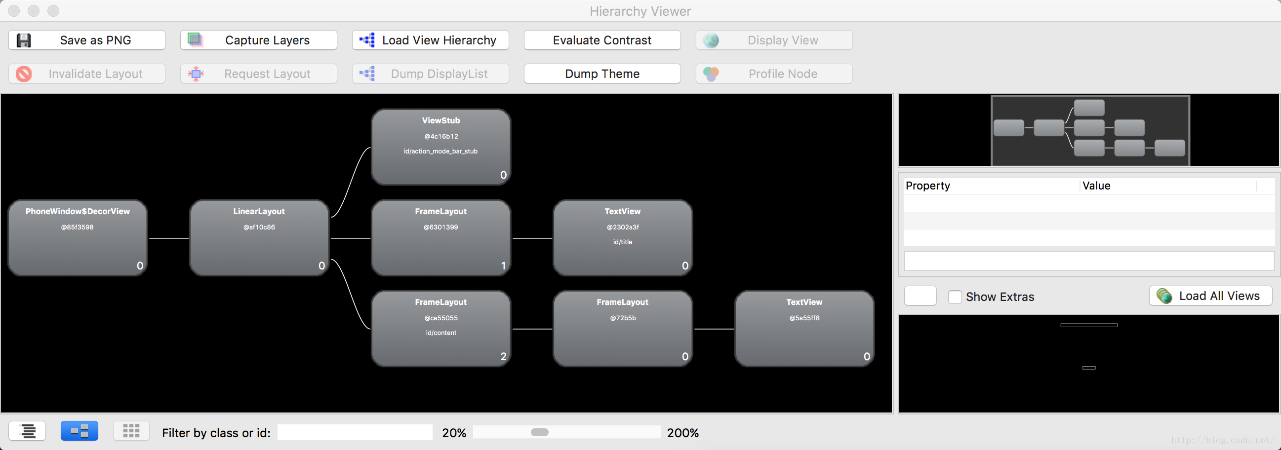 开始讲解代码之前我们先看一下Activity的层级图,学习一下Activity启动之后在屏幕上的视图结构是怎样的,要想清楚Activity的显示层级视图最方便的方式是借助Google给我们提供的工具hierarchyviewer(该工具位于sdk的tools文件夹下)。hierarchyviewer不仅可以把当前正在运行的APP的界面视图层级显示出来,而且还可以通过视图层级优化我们的布局结构。