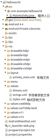 Android环境布置完毕,直接就是一个Helloworld程序,详情请看《利用adt-bundle轻松搭建Android开发环境与Hello world(Linux)》这使得很多人难以理清整个Android项目的基本结构。其实安卓项目,与其它Java工程的项目,SSH、Servlet等,都是采取Java与XML文件联合的方式,形成一个工程的。