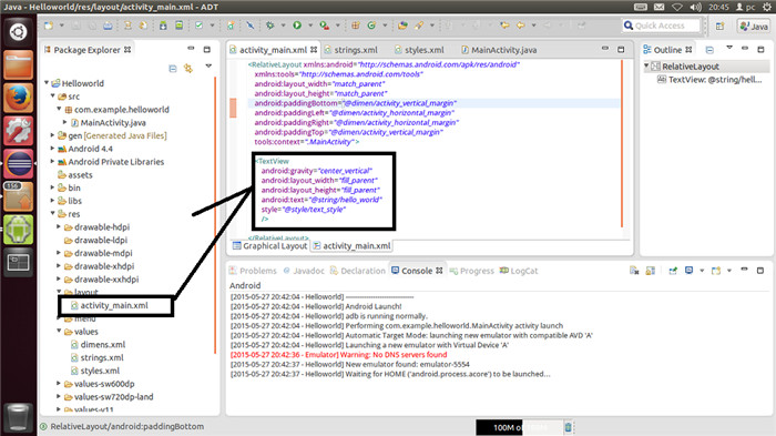 这里原本就有一个TextView的组件,类似于vb,c++,c#的Label组件的标签文本的东西。很正常嘛,因为原来的Helloworld程序就是有一个Helloworld文本在apk的左上角。