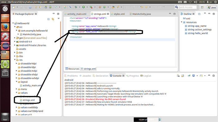 之后这个组件的文本在string.xml的hello_world标签中,这里也可以直接写出相应的值,不过Eclipse会出现警告,因为,如同struts2倡导的那样,把所有东西都用标签表示,便于以后的国际化。在struts2中真的没必要这样做了。在安卓中,这样起码能够适应各个屏幕还能说得过去。