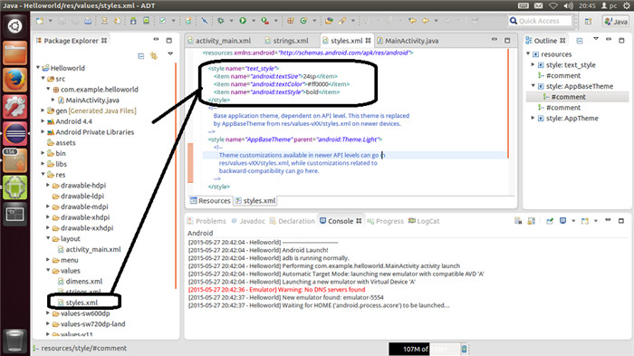 可以在activity_main.xml中看到,这个TextView组件的样式在strings.xml指定的text_style项,之后我们再改改styles.xml,再里面加入一个text_style项,如下代码,给这个Hellowssssssssssssssssorld!字符串加粗变红,这个strings.xml一如网页开发中的css文件。这里唯一值得注意的是,在安卓中的单位是sp,而不是px,这有利于你的安卓程序运行于各大设备。