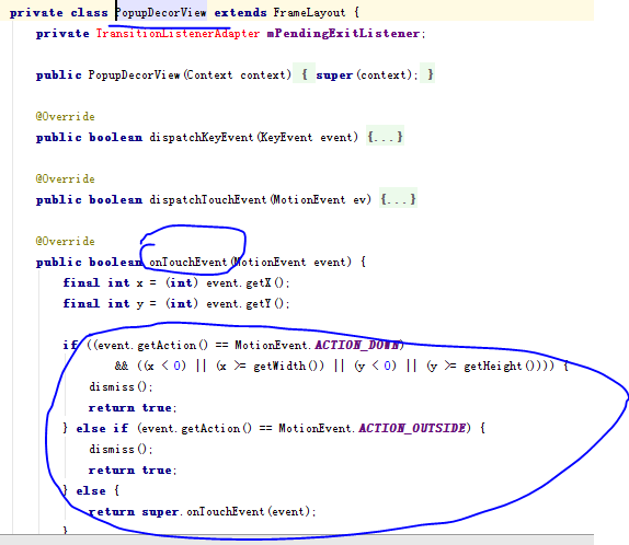 不过,源码已经发生了变化,文章中提到的PopupViewContainer类,在目前的源码(Android6.0)中使用的是PopupBackgroundView和PopupDecorView共同完成的。