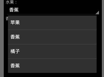 <Spinner android:id="@+id/spinner1" android:layout_width="match_parent" android:layout_height="wrap_content" /> <TextView android:id="@+id/tvResult" android:layout_width="match_parent" android:layout_height="wrap_content" android:text="选择的水果" />
