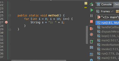 这个模式也相当有用,之前调试程序的时候,如果需要输出一些变量的值,总是需要在代码中写Log,然后重新运行程序,这有才能看到新的输出结果,现在有了日志断点这个神器,就不需要了。下面介绍如何操作,首先还是在断点上点击鼠标右键,把suspend置为非选中状态,然后在下面的Log evaluated Expression填写上你需要输出的信息