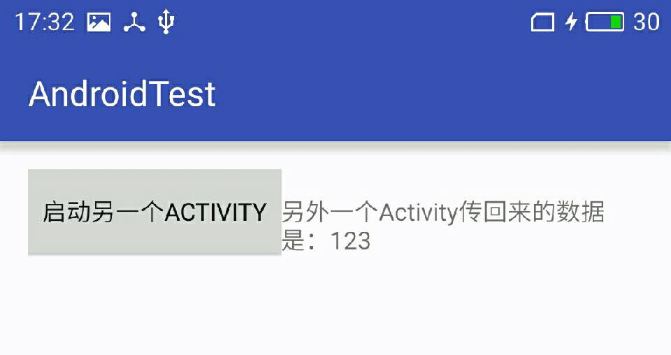 当前Activity:包含一个Button和一个TextView,用于启动另一个Activity和显示传回的数据,这里重写了onActivityResult()方法。