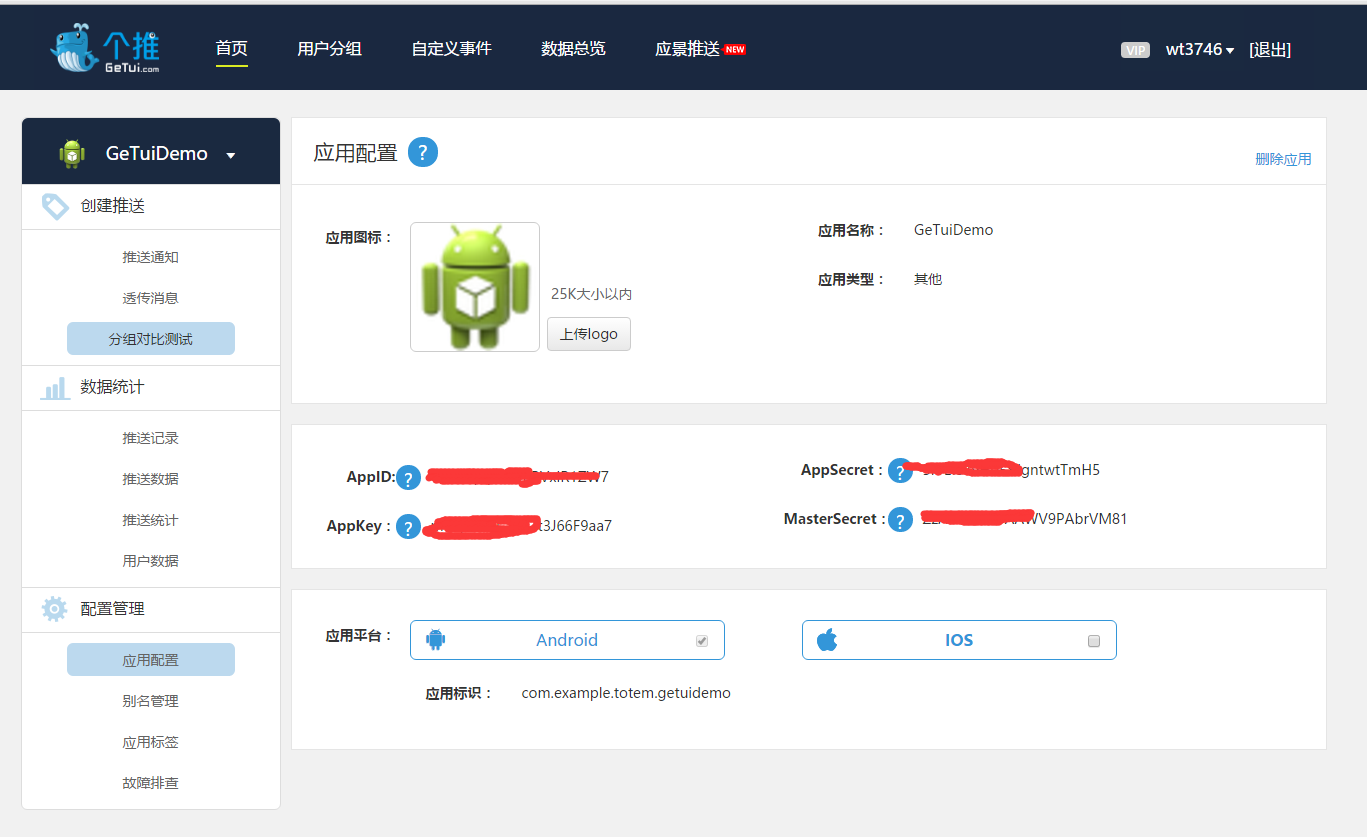 这里有我们想要的数据,AppId,AppKey等等,这些东西都需要在AndroidManifest文件中进行配置.自己做好Demo之后,就可以通过后台发送推送了.