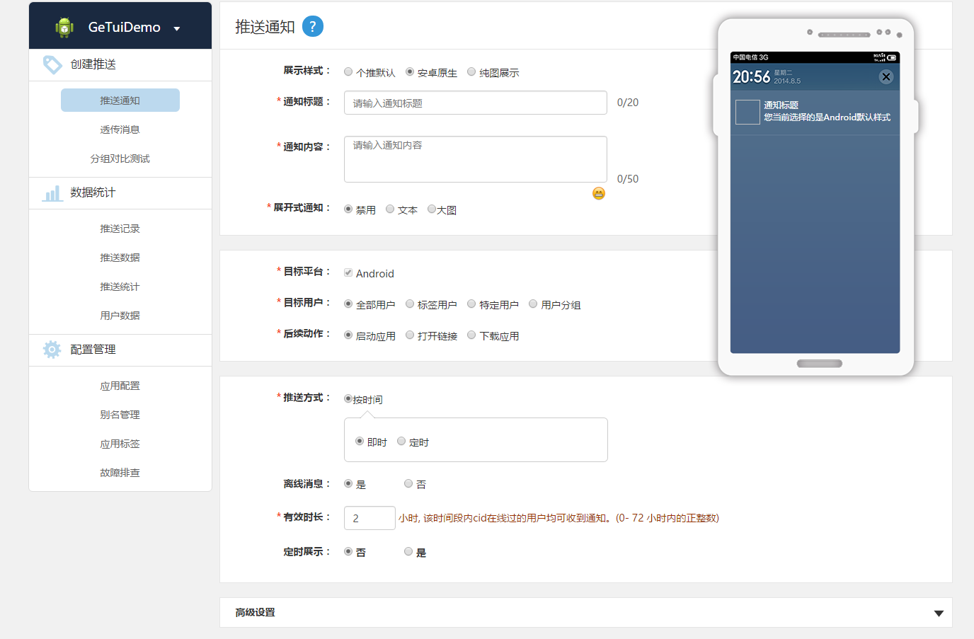 * 可以进行推送控制,设置标签,设置别名,设置默认时间等