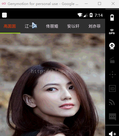 <span style="white-space:pre"> </span>app:tabTextColor="#f5eef5" app:tabSelectedTextColor="#ec4213" app:tabIndicatorColor="#aaff00" </pre><pre name="code" class="html">app:tabTextColor="#f5eef5" //这个是设置标题的字体颜色 app:tabSelectedTextColor="#ec4213" </span>//这个是设置标题被选中时的颜色 app:tabIndicatorColor="#aaff00" </span>//这个是设置下面跟着联动的长方形的颜色 </pre><span style="font-size:14px">具体布局文件代码是: </span><p></p><p></p><pre name="code" class="html"> <?xml version="1.0" encoding="utf-8"?> <RelativeLayout xmlns:android="http://schemas.android.com/apk/res/android" android:layout_width="match_parent" android:layout_height="match_parent" xmlns:app="http://schemas.android.com/apk/res-auto"> <!--app:tabIndicatorHeight="20dp"指示器的高度--> <android.support.design.widget.TabLayout android:id="@+id/main_tab" android:layout_width="match_parent" android:layout_height="50dp" app:tabMode="scrollable" app:tabTextColor="#f5eef5" app:tabSelectedTextColor="#ec4213" app:tabIndicatorColor="#aaff00" /> <android.support.v4.view.ViewPager android:id="@+id/main_viewpager" android:layout_width="match_parent" android:layout_below="@+id/main_tab" android:layout_height="match_parent"/> </RelativeLayout>