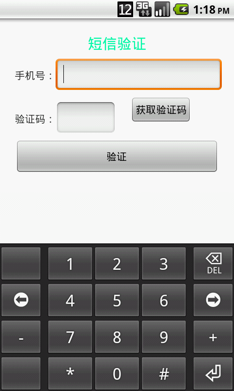 <RelativeLayout xmlns:android="http://schemas.android.com/apk/res/android" xmlns:tools="http://schemas.android.com/tools" android:layout_width="match_parent" android:layout_height="match_parent" tools:context=".MainActivity" > <TextView android:id="@+id/textView2" android:layout_width="wrap_content" android:layout_height="wrap_content" android:layout_centerHorizontal="true" android:layout_marginTop="20dp" android:text="短信验证" android:textColor="#00ffaa" android:textSize="20dp" /> <TextView android:id="@+id/textView1" android:layout_width="wrap_content" android:layout_height="wrap_content" android:layout_alignParentLeft="true" android:layout_below="@+id/textView2" android:layout_marginLeft="20dp" android:layout_marginTop="20dp" android:text="手机号:" /> <EditText android:id="@+id/phone" android:layout_width="wrap_content" android:layout_height="wrap_content" android:layout_alignBaseline="@+id/textView1" android:layout_alignBottom="@+id/textView1" android:layout_toRightOf="@+id/textView1" android:maxLength="11" android:ems="11" android:inputType="phone" > <requestFocus /> </EditText> <TextView android:id="@+id/textView3" android:layout_width="wrap_content" android:layout_height="wrap_content" android:layout_alignLeft="@+id/textView1" android:layout_marginTop="40dp" android:layout_below="@+id/phone" android:text="验证码:"/> <EditText android:id="@+id/cord" android:layout_width="wrap_content" android:layout_height="wrap_content" android:layout_marginTop="20dp" android:layout_alignBaseline="@+id/textView3" android:layout_alignBottom="@+id/textView3" android:layout_alignLeft="@+id/phone" android:ems="4" android:maxLength="4" android:inputType="phone" /> <Button android:id="@+id/getcord" style="?android:attr/buttonStyleSmall" android:layout_width="wrap_content" android:layout_height="wrap_content" android:layout_alignTop="@+id/cord" android:layout_marginLeft="20dp" android:layout_marginTop="10dp" android:layout_toRightOf="@+id/cord" android:visibility="visible" android:text="获取验证码" /> <Button android:id="@+id/savecord" android:layout_width="fill_parent" android:layout_height="wrap_content" android:layout_below="@+id/cord" android:layout_margin="20dp" android:text="验证" /> <TextView android:id="@+id/now" android:layout_width="fill_parent" android:layout_height="wrap_content" android:layout_above="@+id/savecord" android:layout_toRightOf="@+id/cord" android:gravity="center_horizontal" android:visibility="gone" android:text="提示信息" android:textColor="#aaaaaa" /> </RelativeLayout>