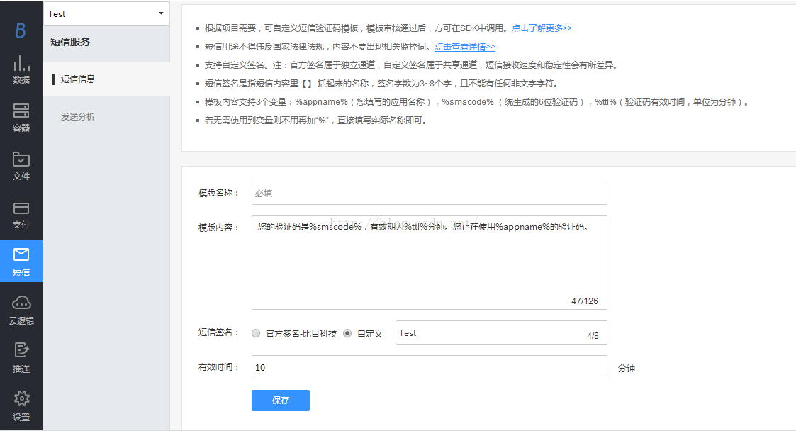 注意:每个 Bmob 帐户有 10 条免费额度的短信数量用于测试,超过需要购买短信条数才能继续使用。