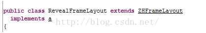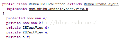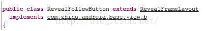 这是类的继承关系,RevealFollowButton继承自RevealFrameLayout,然后继承自ZHFrameLayout,这个ZHFrameLayout的父类就是FrameLayout了,从名字我们能看出,RevelFollowButton和RevealFrameLayout就是这个效果实现的两个类了。