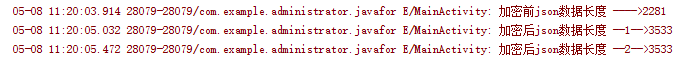 Log.e("MainActivity","加密后json数据长度 --2-->"+encryStr.length());