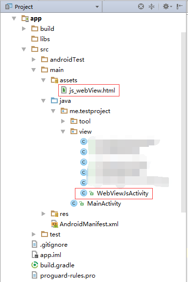 整个项目的结构就是这样的,里面最主要的就是assets下面的js_webView.html文件和代码中的WebViewJsActivity,其中项目里面的MainActivity只是做了个跳转而已,跳转到WebViewJsActivity。就这样。
