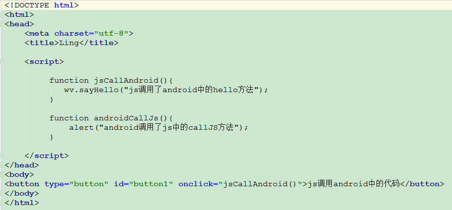 html里面的代码也比较简单,整个html中就一个Button,点击这个Button的时候去执行javascript中的 jsCallAndroid() 方法。