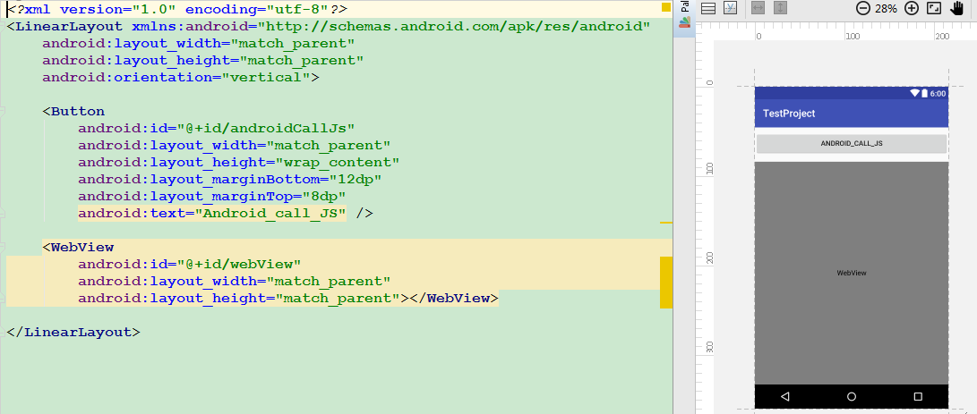 整个布局文件也很简单,一个按钮和一个WebView,按钮是用来测试 Android 调用 js 用的,js 调用 Android 就当然是 webview 加载的网页里面的按钮了。