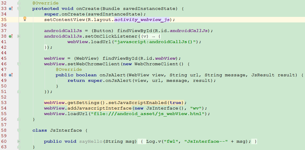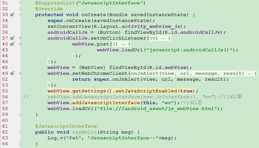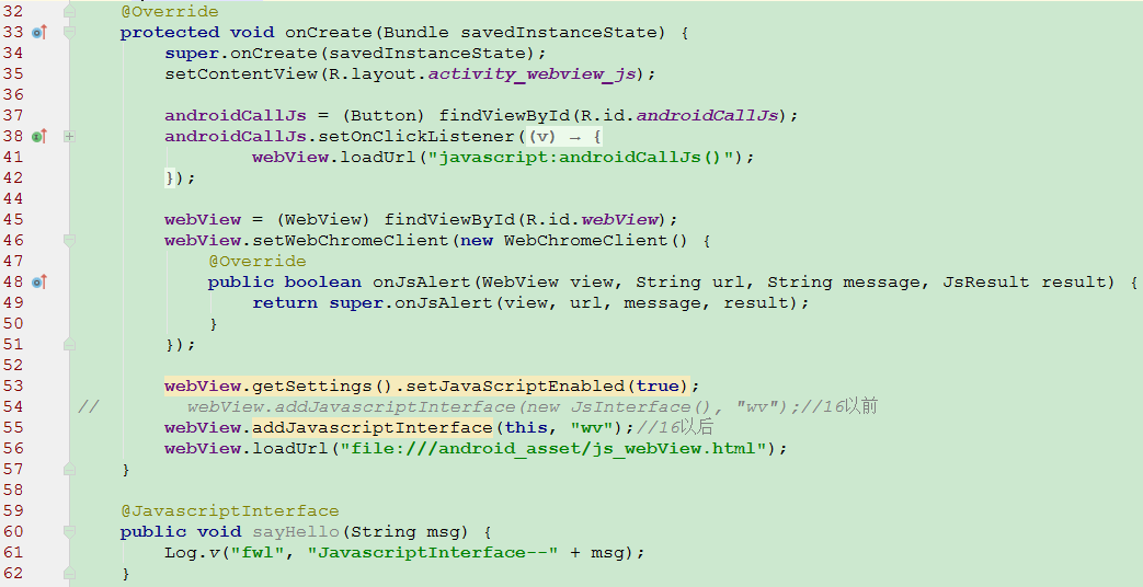 45-55行:这几行就是有关于 Webview 的设置等,46-51 这几行是指支持弹窗,也就是支持 html 网页弹框,因为前面的 html 代码中,有我们 Android 调用 js 的时候,调用成功就 js 弹窗,所以这里要加上这个设置。接下来是53行,53行指的是支持 javascript 这里指的是支持 html 中的 javascript 解析,不管是不是 js 和 Android 交互,只要网页中含有 js ,都要。最关键的就是54行,54行就是 javascript 和 Android 交互的了,addJavascriptInterface 方法需要接受两个参数,第一个是与之相对应的 js 调用 Android 本地的类的对象,这个例子中的就是58-63行这个类的对象,第二个参数就是和前面网页中的js代码中的 jsCallAndroid 方法中的 wv.sayHello(),这里的 wv 就和这个参数(wv)与之相对应,而 sayHello() 就是对应的第一个参数的对象里面的方法。
