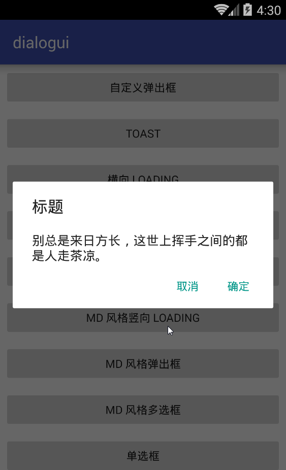 如果不需要使用toast类,可以不操作step1,直接使用相对于的弹出框即可。以下分别是部分弹出框的调用代码案例。