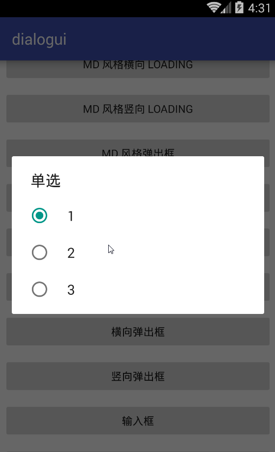 /** * 单选框 默认可取消可点击 * * @param activity 所在activity * @param title 标题 不传则无标题 * @param defaultChosen 默认选中项 * @param words 消息数组 * @param listener 事件监听 */ public static BuildBean showSingleChoose(Activity activity, CharSequence title, int defaultChosen, CharSequence[] words, DialogUIItemListener listener) /** * 单选框 * * @param activity 所在activity * @param title 标题 不传则无标题 * @param defaultChosen 默认选中项 * @param words 消息数组 * @param cancleable true为可以取消false为不可取消 * @param outsideTouchable true为可以点击空白区域false为不可点击 * @param listener 事件监听 */ public static BuildBean showSingleChoose(Activity activity, CharSequence title, int defaultChosen, CharSequence[] words, boolean cancleable, boolean outsideTouchable, DialogUIItemListener listener)