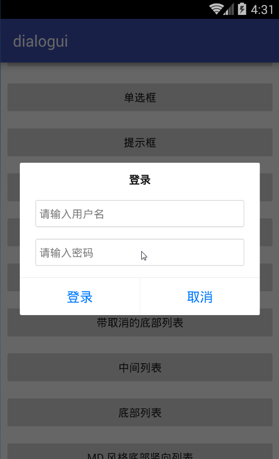 DialogUIUtils.showAlertInput(activity, "登录", "请输入用户名", "请输入密码", "登录", "取消", new DialogUIListener() {