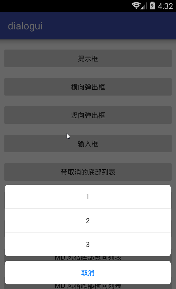 DialogUIUtils.showBottomSheetAndCancel(activity, strings, "取消", new DialogUIItemListener() {