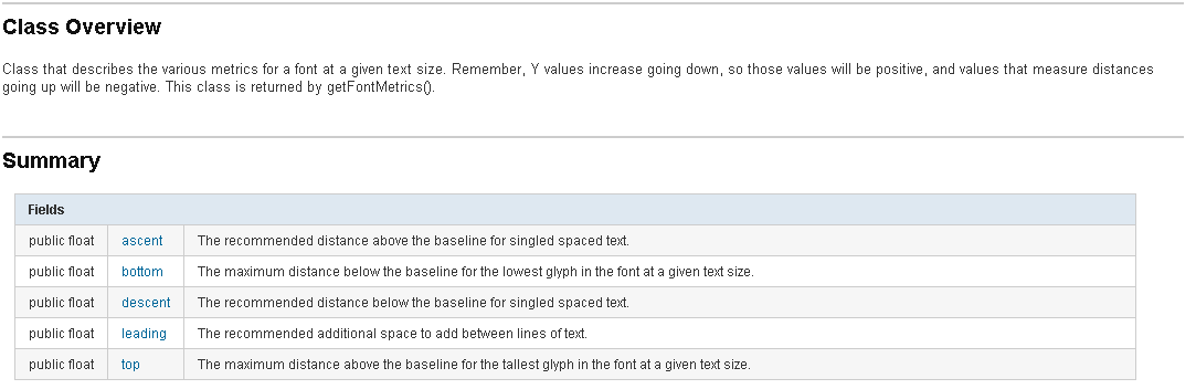 Paint.FontMetrics有5个属性,并且这5个属性都是跟字体相关的,下面是官方API文档的解释:
