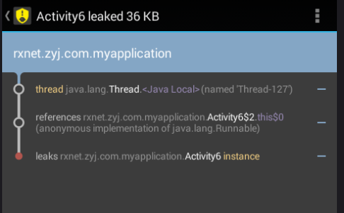 进入Activity6 界面,然后点击finish按钮,Activity6销毁,但是Activity6里面的线程还在运行,匿名内部类Runnable对象引用了Activity6的实例,导致Activity6所占用的内存不能被GC及时回收。