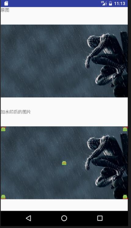 实现的原理就是:获取原始图片的宽高,然后,新建一个同样宽高的bitmap,将这个新的bitmap作为画布,接着,就在这个画布上面画原图,画水印图片,有文字就接着画文字。