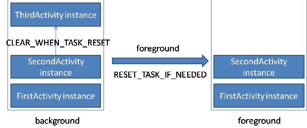 4.FLAG_ACTIVITY_CLEAR_WHEN_TASK_RESET:如果一个Intent中包含此属性,则它转向的那个Activity以及在那个Activity其上的所有Activity都会在task重置时被清除出task。当我们将一个后台的task重新回到前台时,系统会在特定情况下为这个动作附带一个FLAG_ACTIVITY_RESET_TASK_IF_NEEDED标记,意味着必要时重置task,这时FLAG_ACTIVITY_CLEAR_WHEN_TASK_RESET就会生效。经过测试发现,对于一个处于后台的应用,如果在主选单点击应用,这个动作中含有FLAG_ACTIVITY_RESET_TASK_IF_NEEDED标记,长按Home键,然后点击最近记录,这个动作不含FLAG_ACTIVITY_RESET_TASK_IF_NEEDED标记,所以前者会清除,后者不会。关于这个标记,可以下图示之: