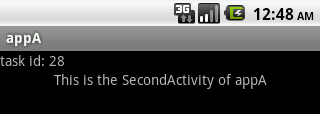 通常两个应用分别有自己的task,它们的taskid肯定不同,但这里的SecondActivity却显示taskid与appB相同,我们想一下也许就明白了,原来它是appB迁徙过来的,再启动appA时并未生成任何新的Activity实例。这个时候如果我们按下后退键,appA就会立即退出,证明了此时appA的task里只有一个Activity实例,也就是这个SecondActivity实例。