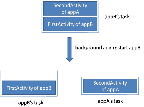 我们看到差别了吧,当我们再次启动appB时已经看不到刚才启动的appA中的SecondActivity,而启动appA时却直接看到了,说明这个SecondActivity实例并不在appB的task内,而是创建了一个task,这个task的affinity就是SecondActivity默认的affinity,由于appA的SecondActivity的affinity是从Application继承而来,所以当appA启动时会直接找到这个task,而不是创建新的task。我们看一下解析图: