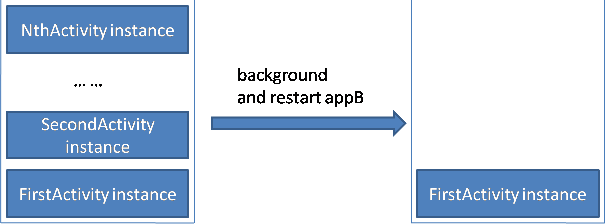我们看到,再次启动appB时,我们只能看到FirstActivity界面,此时在FirstActivity之上的所有Activity都已经被清除出栈。示意图如下: