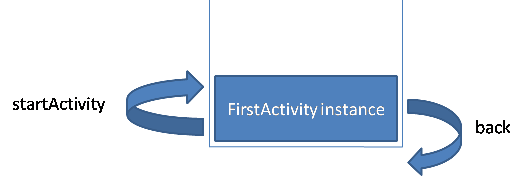 我们看到这个结果跟standard有所不同,三个序列号是相同的,也就是说使用的都是同一个FirstActivity实例;如果按一下后退键,程序立即退出,说明当前栈结构中只有一个Activity实例。singleTop模式的原理如下图所示:
