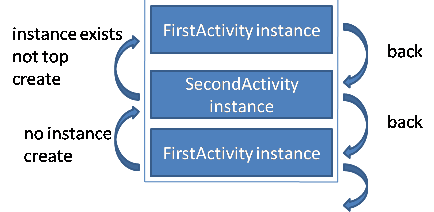 如图所示,每次跳转系统都会在task中生成一个新的FirstActivity实例,并且放于栈结构的顶部,当我们按下后退键时,才能看到原来的FirstActivity实例。
