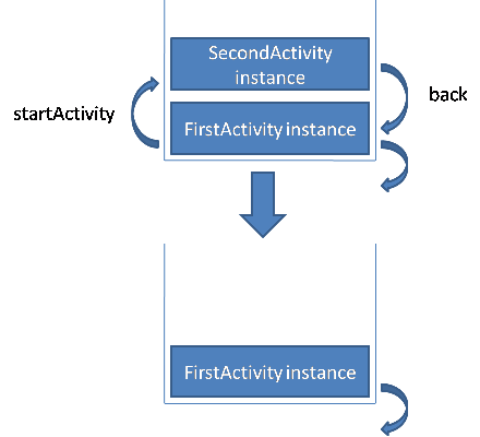 我们看到从FirstActivity跳转到SecondActivity时,重新启用了一个新的栈结构,来放置SecondActivity实例,然后按下后退键,再次回到原始栈结构;图中下半部分显示的在SecondActivity中再次跳转到FirstActivity,这个时候系统会在原始栈结构中生成一个FirstActivity实例,然后回退两次,注意,并没有退出,而是回到了SecondActivity,为什么呢?是因为从SecondActivity跳转到FirstActivity的时候,我们的起点变成了SecondActivity实例所在的栈结构,这样一来,我们需要“回归”到这个栈结构。