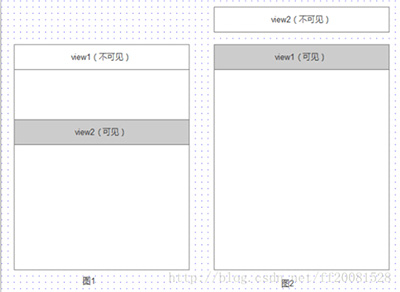 2、当页面向下滑动,从状态B转变到状态A的瞬间,view2正好和view1重合的瞬间,将view1隐藏。