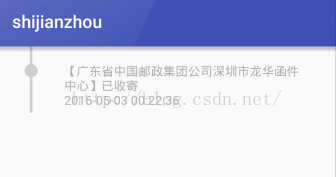 <?xml version="1.0" encoding="utf-8"?> <LinearLayout xmlns:android="http://schemas.android.com/apk/res/android" android:layout_width="match_parent" android:layout_height="75dp" android:orientation="horizontal"> <!--线条部分--> <LinearLayout android:layout_width="wrap_content" android:layout_height="match_parent" android:gravity="center_horizontal" android:orientation="vertical" android:paddingLeft="30dp"> <View android:layout_width="3dp" android:layout_height="20dp" android:background="#CBCBCB" /> <ImageView android:layout_width="15dp" android:layout_height="15dp" android:background="@drawable/time_cycle" /> <View android:layout_width="3dp" android:layout_height="40dp" android:background="#CBCBCB" /> </LinearLayout> <!--文字部分--> <LinearLayout android:layout_width="match_parent" android:layout_height="match_parent" android:orientation="vertical" android:paddingLeft="30dp" android:paddingRight="30dp" android:paddingTop="20dp"> <TextView android:id="@+id/tv_content" android:layout_width="wrap_content" android:layout_height="wrap_content" android:text="【广东省中国邮政集团公司深圳市龙华函件中心】已收寄" android:textColor="#ABABAB" /> <TextView android:id="@+id/tv_time" android:layout_width="wrap_content" android:layout_height="wrap_content" android:layout_below="@id/tv_content" android:text="2016-05-03 00:22:36" android:textColor="#ABABAB" /> </LinearLayout> </LinearLayout>