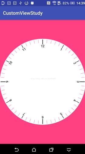这个方法代码看起来也没有什么主要是把一个圆分成60份,因为我们钟表上是有60个刻度,其中设置了4个大刻度分别为0,15,30,45.分别对应的钟表中12点 3点 6点和9点,如果这个地方你有什么疑惑的吧你可以看看你的手表或者钟表就明白了,同时里面也设置了8个中等刻度分别为5,10,20,25,35,40,50,55为中刻度,其实对应的就是1,2,4,5,7,8,10,11点。这里主要是自己觉得这样分明好看而已,如果没有强迫症的你可以直接设置都是大刻度就可以了。其他的都为小刻度,根据自己在attr设置的颜色和尺寸分别设置画笔paint来绘制就可以了。看下我们的效果变成了这样子: